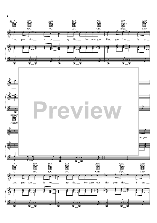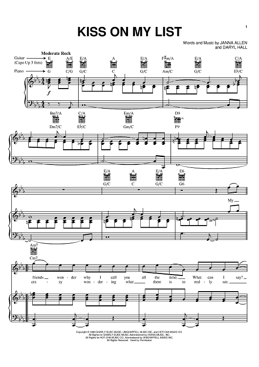 Digital Sheet Music for Kiss On My List by Daryl Hall, Janna Allen scored for Piano/Vocal/Chords; id:381342