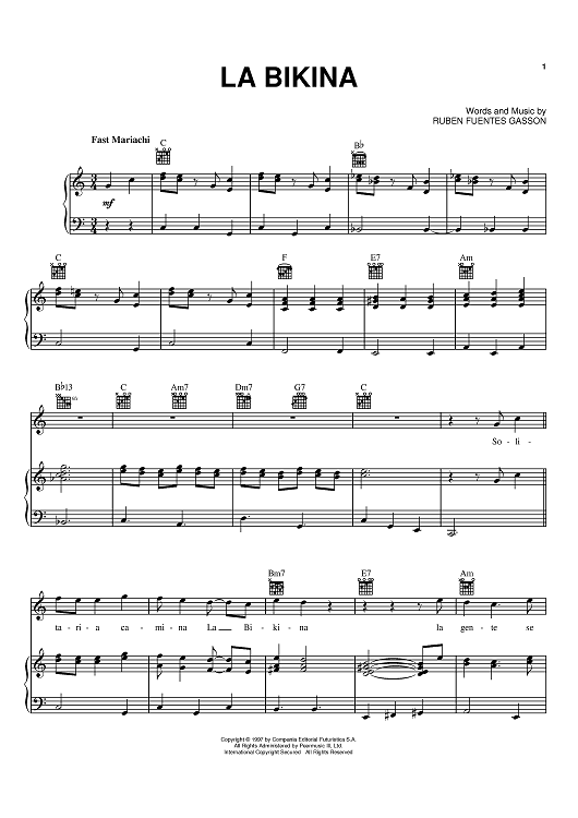 Digital Sheet Music for La Bikina by Ruben Fuentes Gasson scored for Piano/Vocal/Chords; id:371155