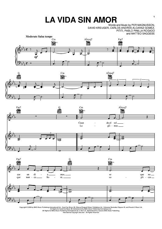 Digital Sheet Music for La Vida Sin Amor by David Kreuger, Per Magnusson, Matteo Saggese, Il Divo, Carlos Andres Alcaraz Gomez, Pititi, Pablo Pinilla Rogado scored for Piano/Vocal/Chords; id:397504