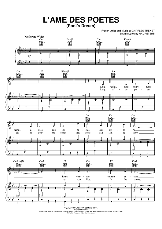 Digital Sheet Music for L'ame Des Poetes (Poet's Dream) by Charles Trenet, Mal Peters scored for Piano/Vocal/Chords; id:395215