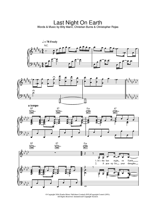 Digital Sheet Music for Last Night On Earth by Billy Mann, Christian Burns, Delta Goodrem, Christopher Rojas scored for Piano/Vocal/Chords; id:381720