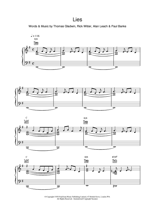 Digital Sheet Music for Lies by Shed Seven scored for Piano/Vocal/Chords; id:376216