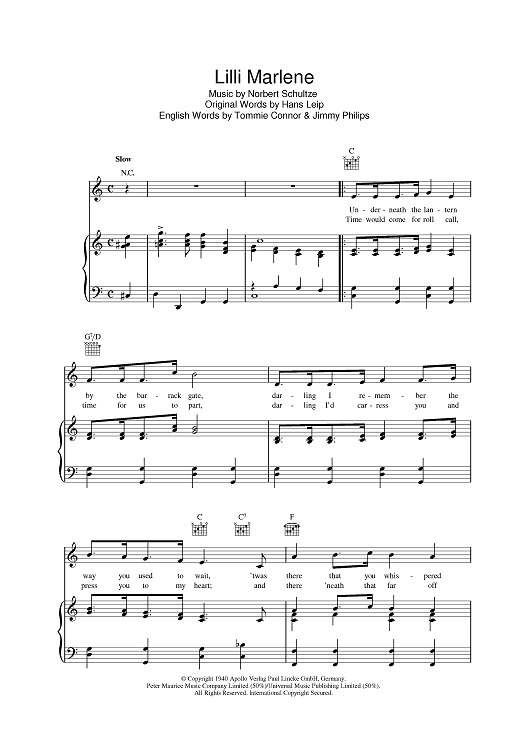 Digital Sheet Music for Lilli Marlene by Tommie Connor, Hans Leip, Norbert Schultze, Johannes Dietrich, Jimmy Philips scored for Piano/Vocal/Chords; id:393223