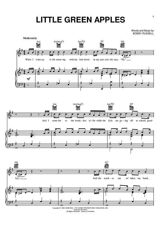 Digital Sheet Music for Little Green Apples by Roger Miller, Bobby Russell, O. C. Smith scored for Piano/Vocal/Chords; id:381541
