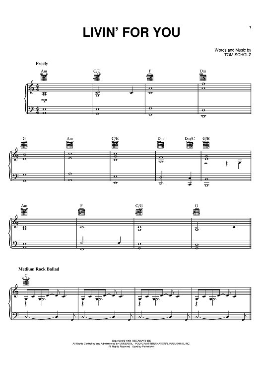 Digital Sheet Music for Livin' For You by Boston, Tom Scholz scored for Piano/Vocal/Chords; id:402812