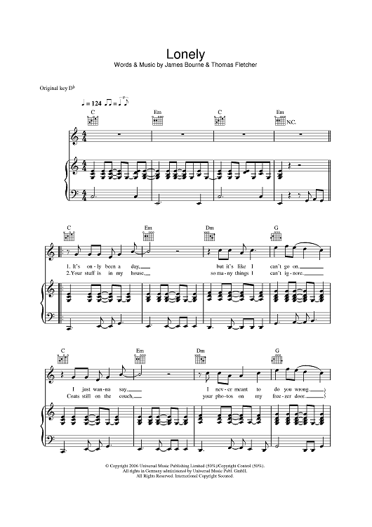 Digital Sheet Music for Lonely by Tom Fletcher, McFly, James Bourne scored for Piano/Vocal/Chords; id:395726