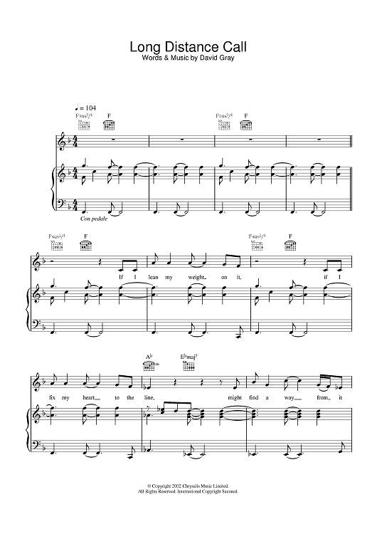 Digital Sheet Music for Long Distance Call by David Gray scored for Piano/Vocal/Chords; id:377769