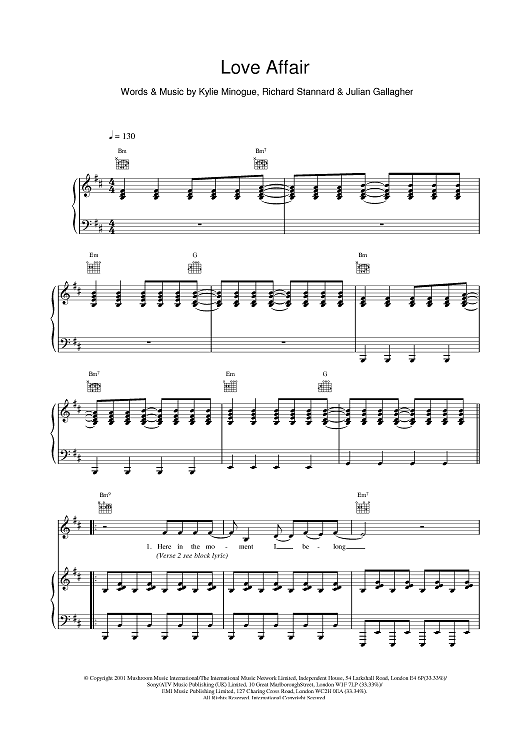 Digital Sheet Music for Love Affair by Kylie Minogue, Richard Stannard, Julian Gallagher scored for Piano/Vocal/Chords; id:382606