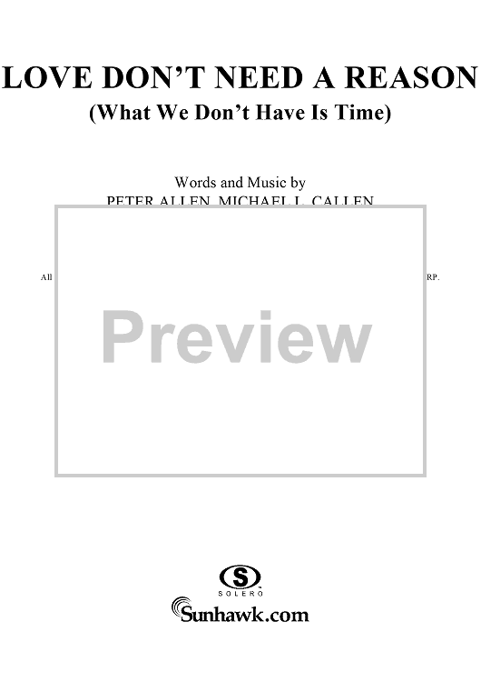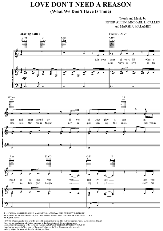 Digital Sheet Music for Love Don't Need a Reason (What We Don't Have Is Time) by Marsha Malamet, Peter Allen, Michael Callen scored for Piano/Vocal/Chords; id:305405