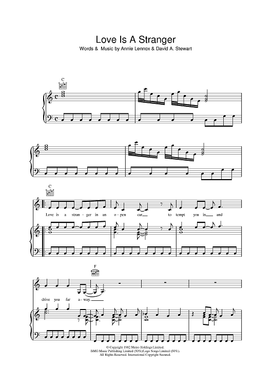 Digital Sheet Music for Love Is A Stranger by Annie Lennox, Dave Stewart, Eurythmics scored for Piano/Vocal/Chords; id:392862