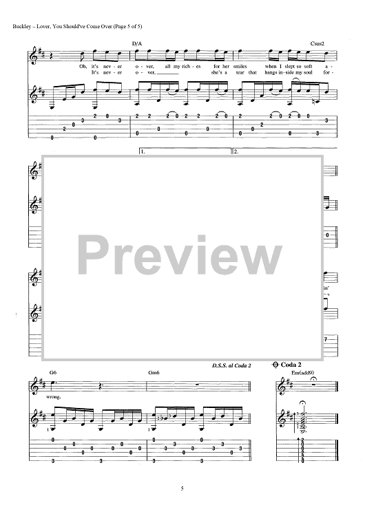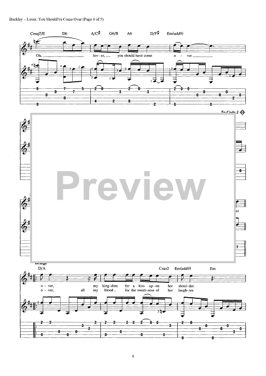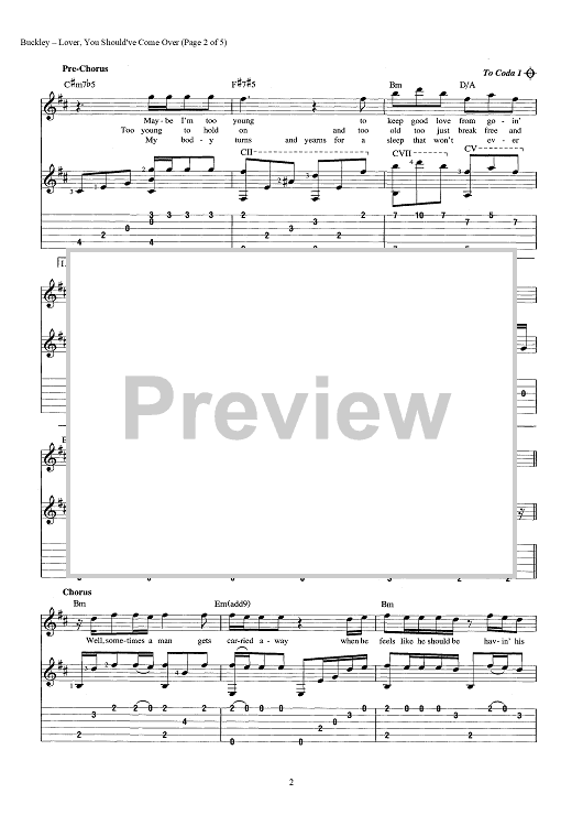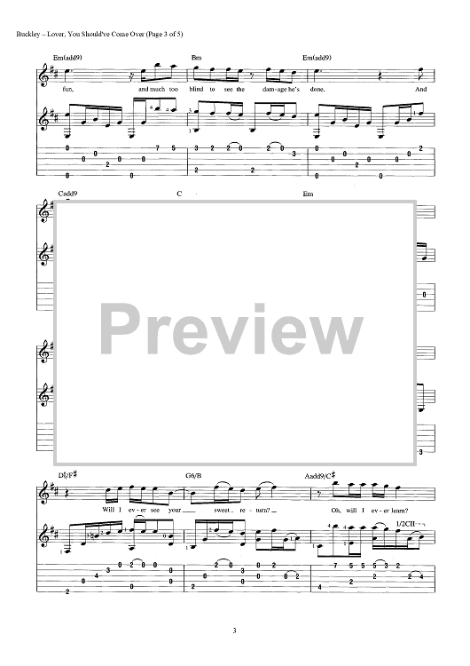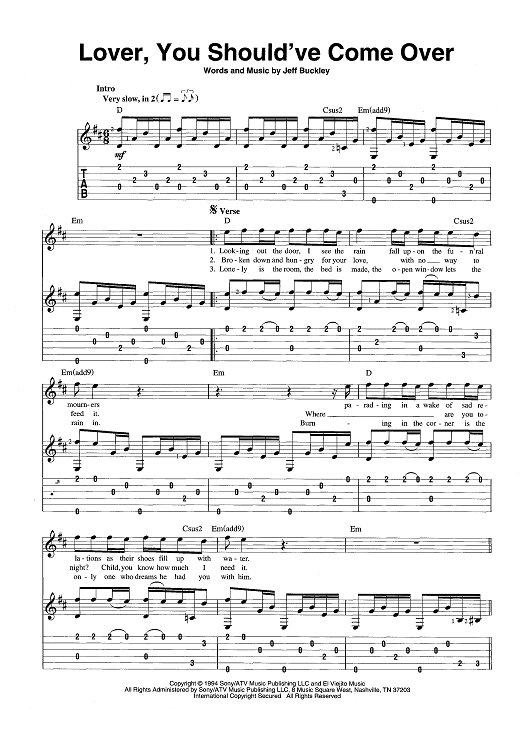 Digital Sheet Music for Lover, You Should Have Come Over by Jeff Buckley scored for Guitar Tab/Vocal/Chords; id:442955