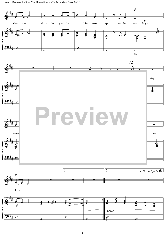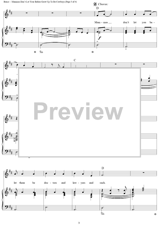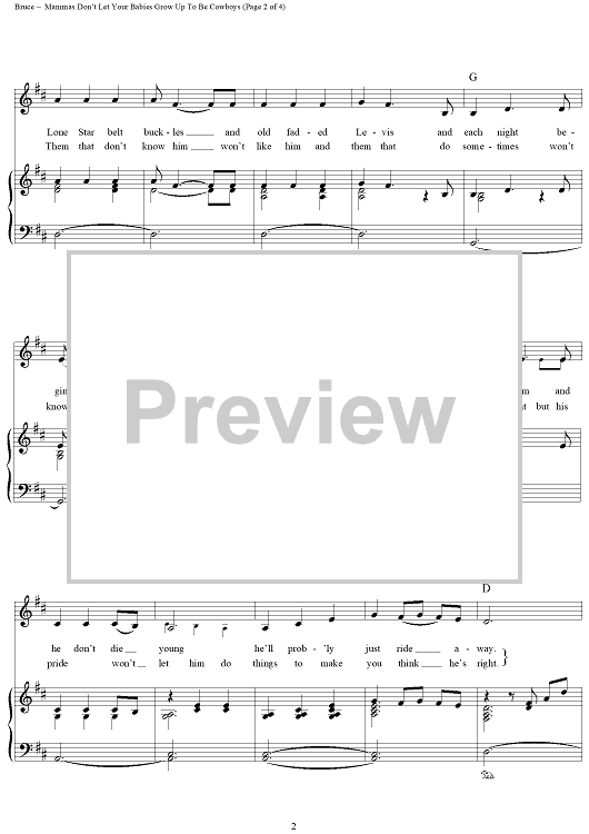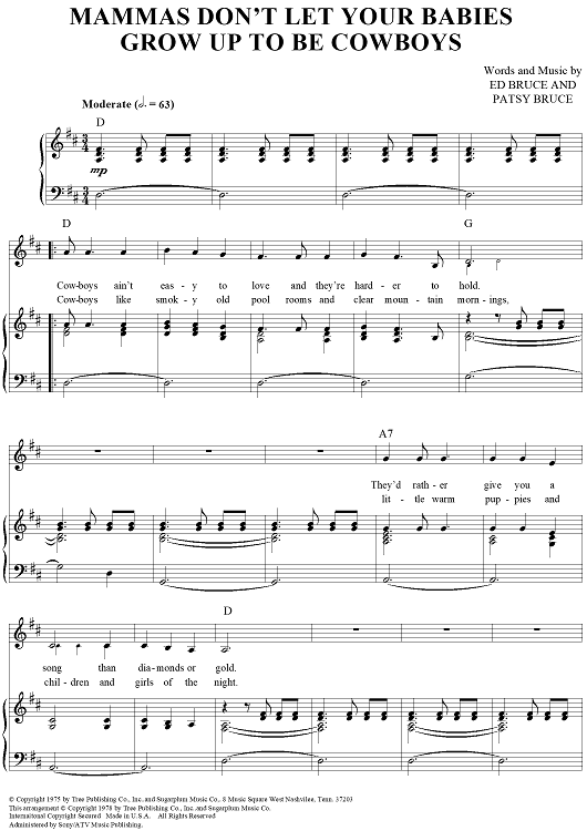 Digital Sheet Music for Mammas Don't Let Your Babies Grow Up To Be Cowboys by Ed Bruce, Patsy Bruce, Willie Nelson scored for Piano/Vocal/Chords; id:360948