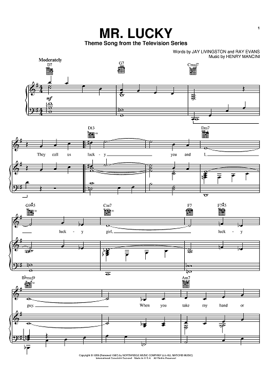 Digital Sheet Music for Mr. Lucky by Henry Mancini, Jay Livingston, Ray Evans scored for Piano/Vocal/Chords; id:381542