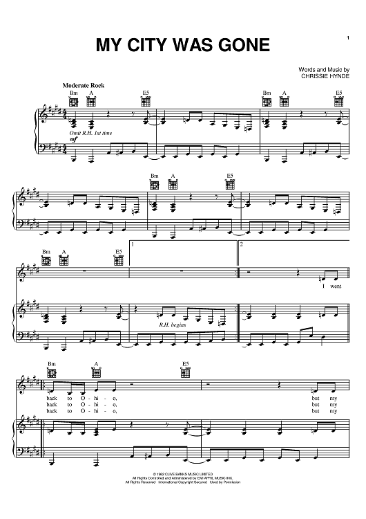 Digital Sheet Music for My City Was Gone by The Pretenders, Chrissie Hynde scored for Piano/Vocal/Chords; id:393700