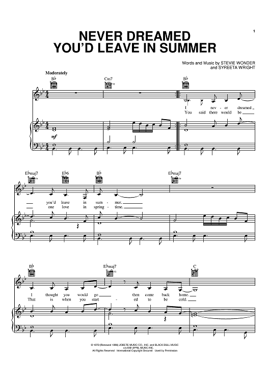 Digital Sheet Music for Never Dreamed You'd Leave In Summer by Stevie Wonder, Syreeta Wright scored for Piano/Vocal/Chords; id:370272