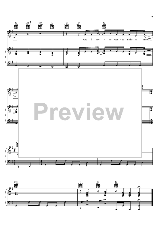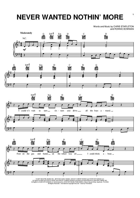 Digital Sheet Music for Never Wanted Nothin' More by Kenny Chesney, Ronnie Bowman, Chris Stapleton scored for Piano/Vocal/Chords; id:398368