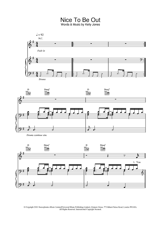 Digital Sheet Music for Nice To Be Out by Kelly Jones, Stereophonics scored for Piano/Vocal/Chords; id:380059
