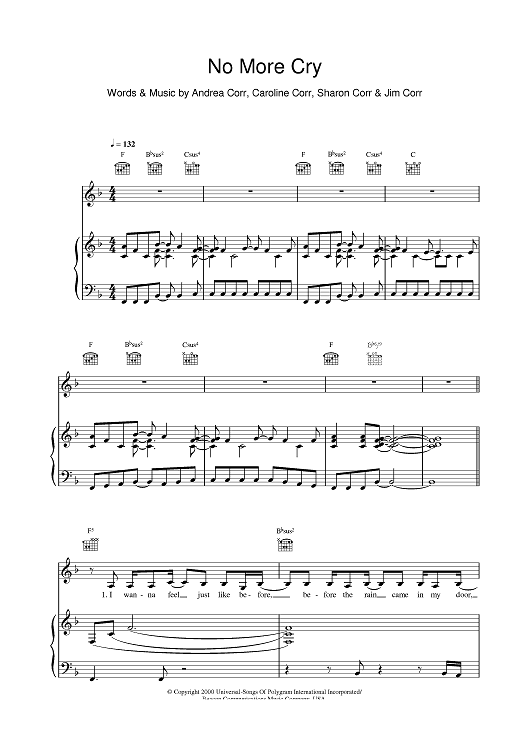 Digital Sheet Music for No More Cry by The Corrs, Sharon Corr, Caroline Corr, Andrea Corr, Jim Corr scored for Piano/Vocal/Chords; id:377118