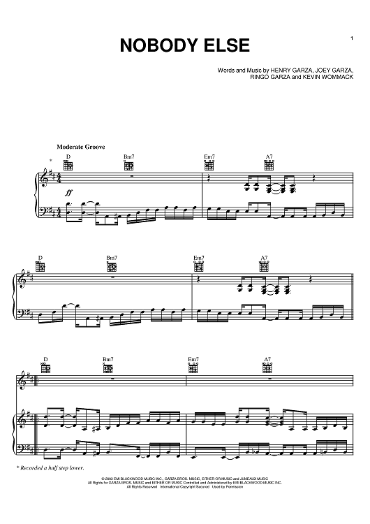 Digital Sheet Music for Nobody Else by Henry Garza, Joey Garza, Ringo Garza, Los Lonely Boys, Kevin Wommack scored for Piano/Vocal/Chords; id:380562