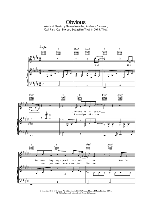 Digital Sheet Music for Obvious by Westlife scored for Piano/Vocal/Chords; id:378432