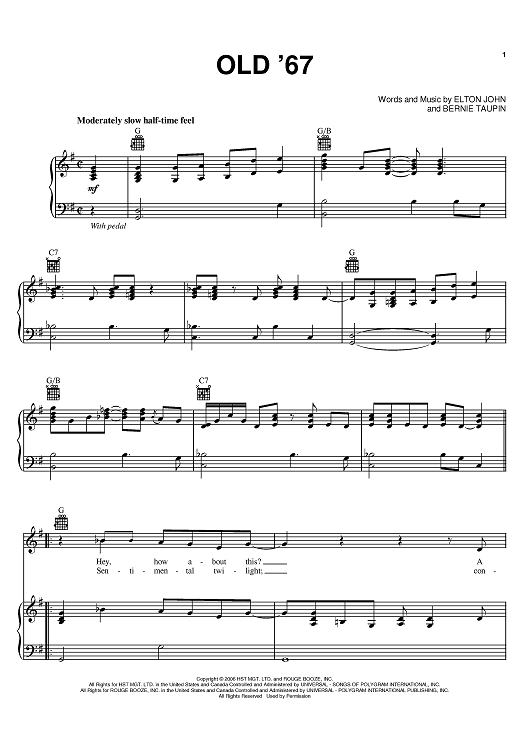 Digital Sheet Music for Old 67 by Elton John, Bernie Taupin scored for Piano/Vocal/Chords; id:396315
