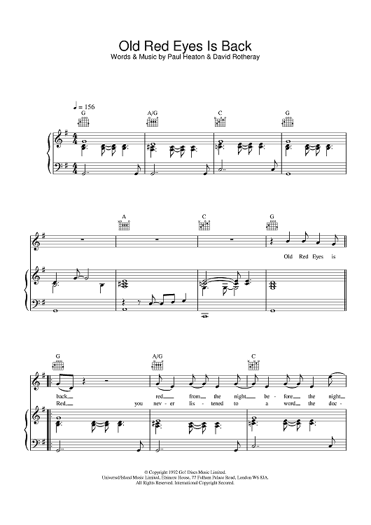 Digital Sheet Music for Old Red Eyes Is Back by The Beautiful South scored for Piano/Vocal/Chords; id:376982