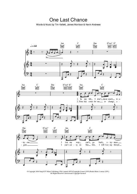 Digital Sheet Music for One Last Chance by James Morrison, Kevin Andrews, Tim Kellett scored for Piano/Vocal/Chords; id:393652