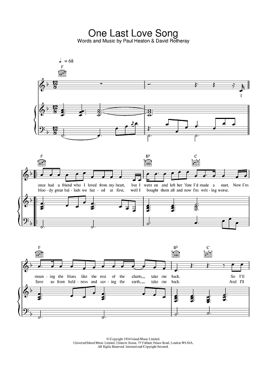 Digital Sheet Music for One Last Love Song by The Beautiful South scored for Piano/Vocal/Chords; id:376983