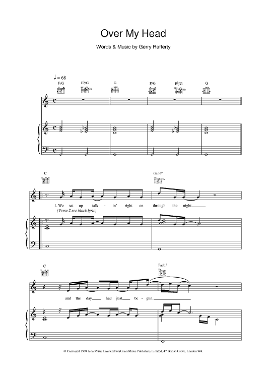 Digital Sheet Music for Over My Head by Gerry Rafferty scored for Piano/Vocal/Chords; id:376116