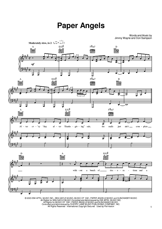 Digital Sheet Music for Paper Angels by Don Sampson, Jimmy Wayne scored for Piano/Vocal/Chords; id:382272