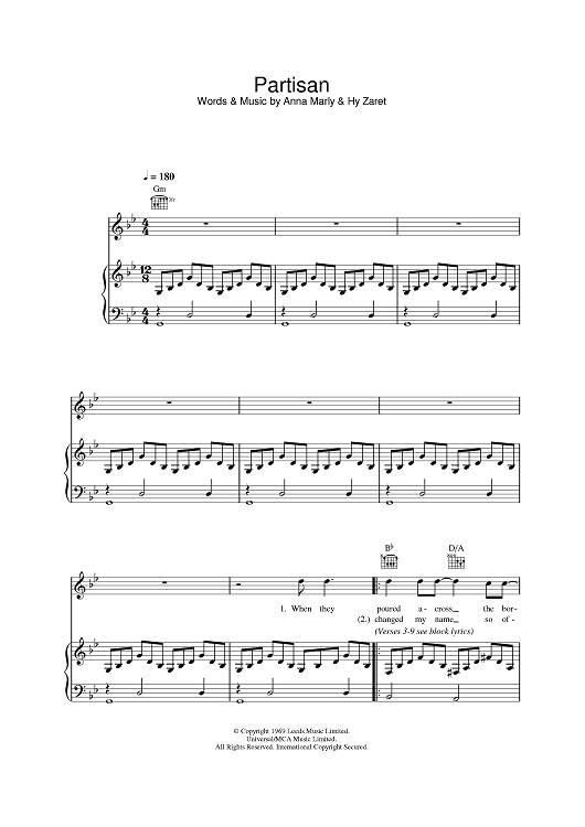 Digital Sheet Music for Partisan by Hy Zaret, Anna Marly, Leonard Cohen scored for Piano/Vocal/Chords; id:380890