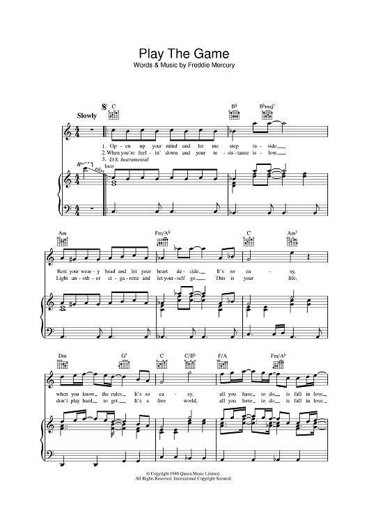 Digital Sheet Music for Play The Game by Queen, Freddie Mercury scored for Piano/Vocal/Chords; id:391536