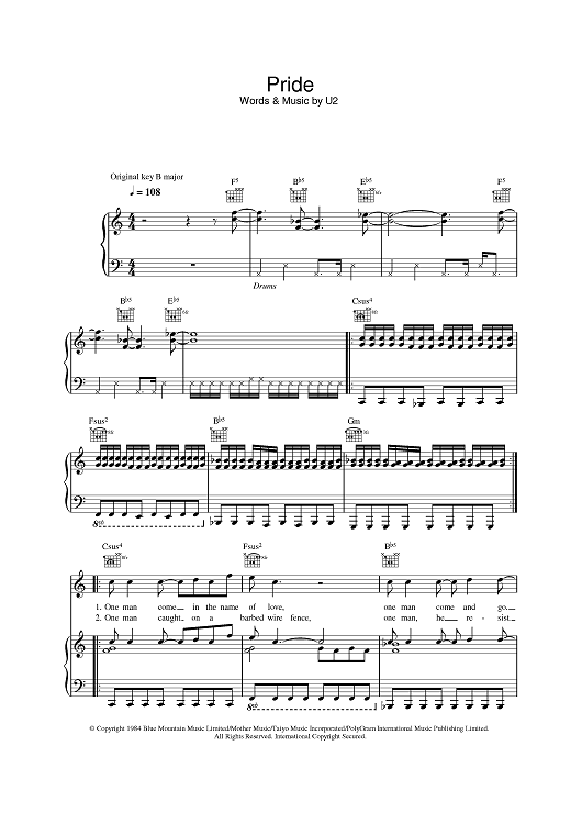 Digital Sheet Music for Pride (In The Name Of Love) by U2, Bono, The Edge scored for Piano/Vocal/Chords; id:385166