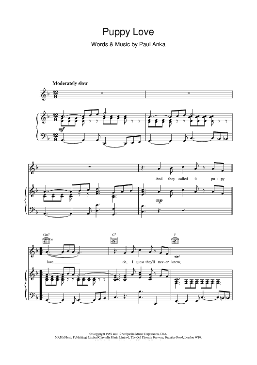 Digital Sheet Music for Puppy Love by Paul Anka scored for Piano/Vocal/Chords; id:375601