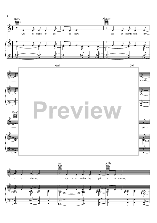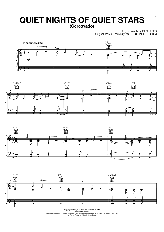 Digital Sheet Music for Quiet Nights Of Quiet Stars (Corcovado) by Andy Williams, Sarah Vaughan, Antonio Carlos Jobim, Gene Lees scored for Piano/Vocal/Chords; id:379477