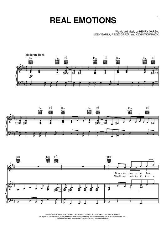 Digital Sheet Music for Real Emotions by Henry Garza, Joey Garza, Ringo Garza, Los Lonely Boys, Kevin Wommack scored for Piano/Vocal/Chords; id:380563