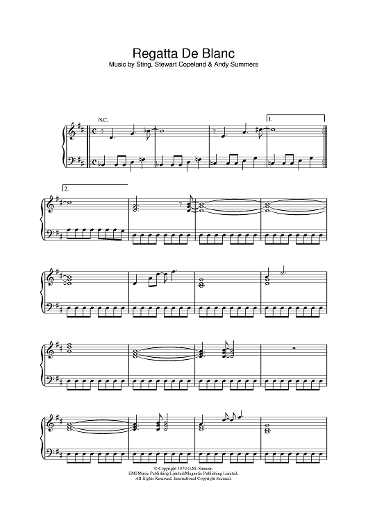 Digital Sheet Music for Regatta De Blanc by Sting, The Police, Stewart Copeland, Andy Summers scored for Piano/Vocal/Chords; id:390047