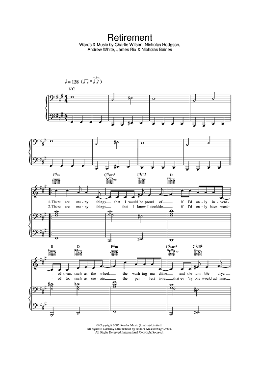 Digital Sheet Music for Retirement by Nick Baines, Nick Hodgson, Kaiser Chiefs, Simon Rix, Andrew White, Charlie Wilson scored for Piano/Vocal/Chords; id:397035