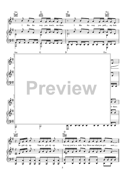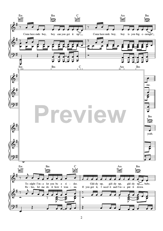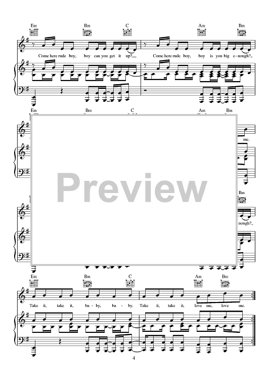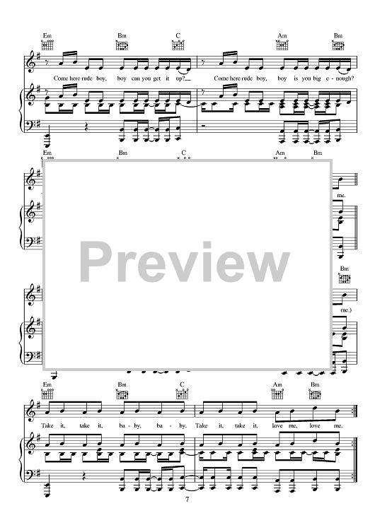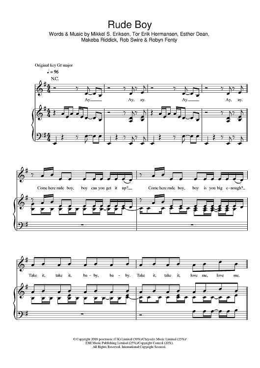 Digital Sheet Music for Rude Boy by Tor Erik Hermansen, Rihanna, Robyn Fenty, Makeba Riddick, Rob Swire, Ester Dean, Mikkel Eriksen scored for Piano/Vocal/Chords; id:410890