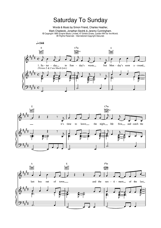Digital Sheet Music for Saturday To Sunday by The Levellers scored for Piano/Vocal/Chords; id:376244