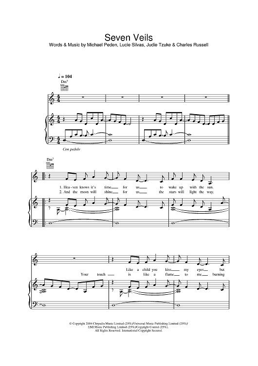 Digital Sheet Music for Seven Veils by Michael Peden, Charles Russell, Lucie Silvas scored for Piano/Vocal/Chords; id:381671