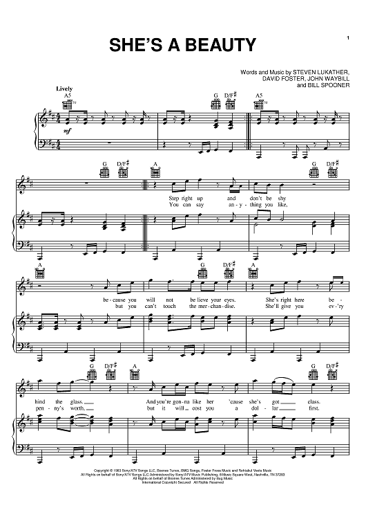 Digital Sheet Music for She's A Beauty by Steven Lukather, Bill Spooner, The Tubes, John Waybill, David Foster scored for Piano/Vocal/Chords; id:388224