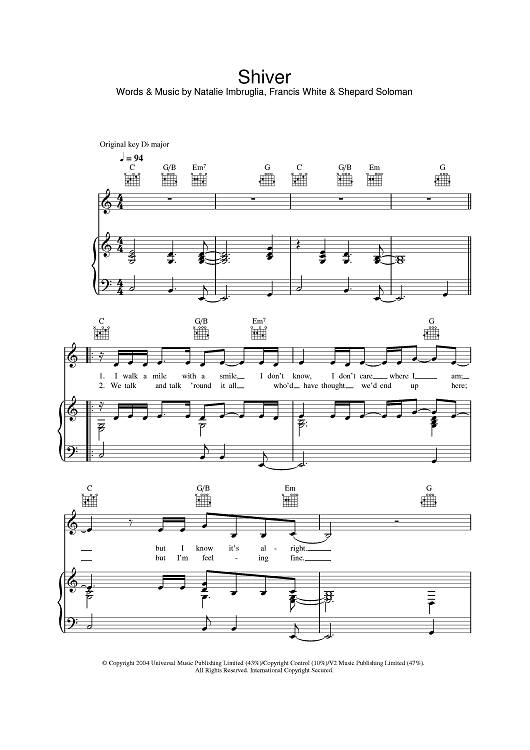 Digital Sheet Music for Shiver by Natalie Imbruglia, Shepard Soloman, Francis White scored for Piano/Vocal/Chords; id:384044