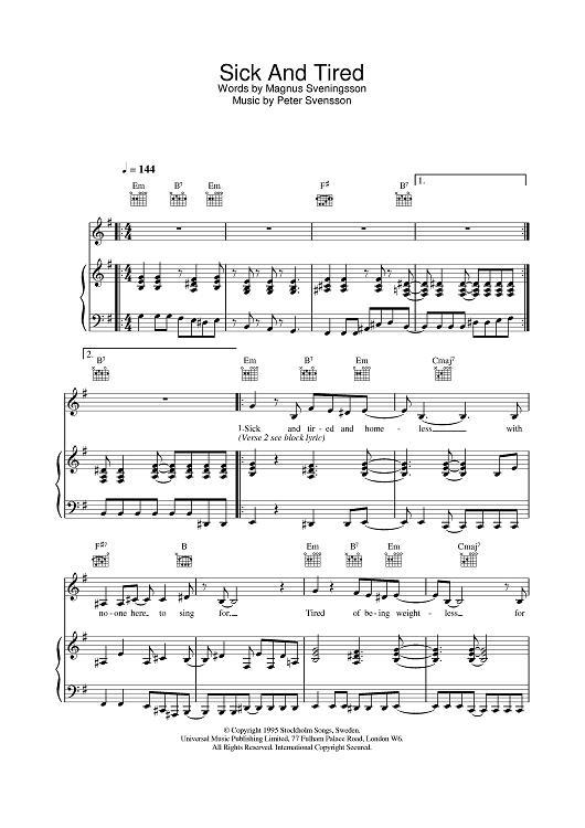 Digital Sheet Music for Sick And Tired by Peter Svensson, The Cardigans, Magnus Sveningsson scored for Piano/Vocal/Chords; id:379098