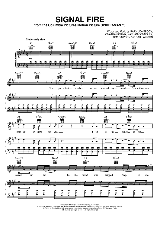 Digital Sheet Music for Signal Fire by Paul Wilson, Gary Lightbody, Tom Simpson, Jonathan Quinn, Nathan Connolly, Snow Patrol scored for Piano/Vocal/Chords; id:398088