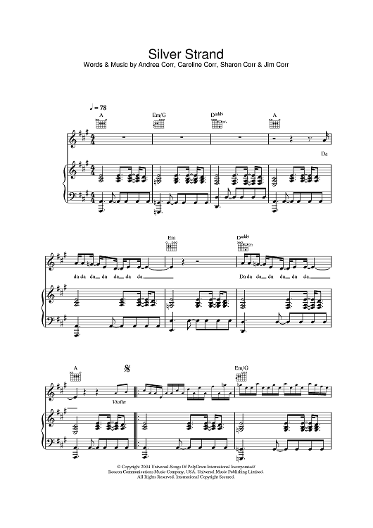 Digital Sheet Music for Silver Strand by The Corrs, Sharon Corr, Caroline Corr, Andrea Corr scored for Piano/Vocal/Chords; id:382930