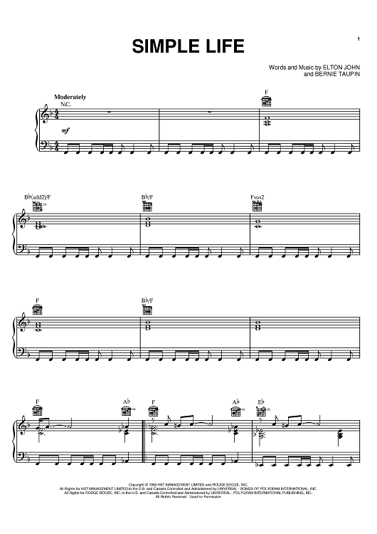 Digital Sheet Music for Simple Life by Elton John, Bernie Taupin scored for Piano/Vocal/Chords; id:392578