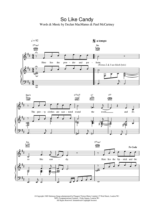 Digital Sheet Music for So Like Candy by Elvis Costello scored for Piano/Vocal/Chords; id:376922