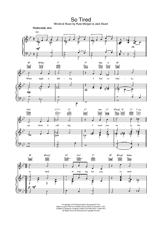 Digital Sheet Music for So Tired by Russ Morgan, Jack Stuart scored for Piano/Vocal/Chords; id:375650