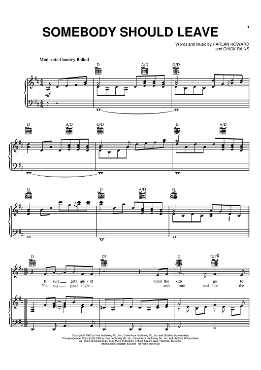 Digital Sheet Music for Somebody Should Leave by Reba McEntire, Harlan Howard, Chick Rains scored for Piano/Vocal/Chords; id:386538